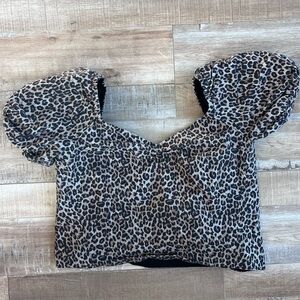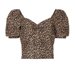 Brown leopard printed cotton (97% Cotton, 3% Elastane). Top. Short sleeves. Sweetheart neckline. 13.5" from shoulder to hemline.