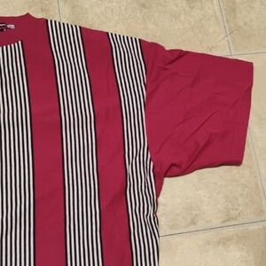 Bold burgundy tee with striking white n black stripes. Short sleeves for casual style. Has the name of company which started in France in 1974. This was made in USA. back bottom has GIRBAUD. really sharp looking. one size fits most. measurements are approximately lying flat pit to pit 25" length 30 back 32.