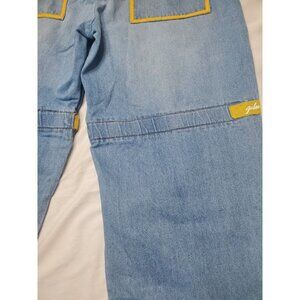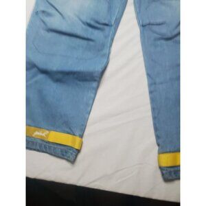 The Marithe Francois Girbaud M+FG Sz 36M Shuttle Tape Denim Jeans are a vintage pair of 90s baggy Y2K wide leg jeans featuring a high rise waist and a relaxed fit. Made of cotton denim with a solid blue color, these jeans have a zip closure, button and strap accents, and a cargo pocket detail. With a 32-inch inseam and a 36-inch waist size, these jeans are perfect for all seasons and are machine washable for easy care. The Girbaud brand and the streetwear, Y2K, and grunge themes make these jeans a stylish and comfortable choice for men looking to add a touch of nostalgia to their wardrobe.