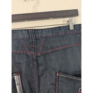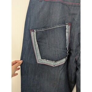 Marithe Francois Girbaud presents a pair of 90s era men's jeans in a dark blue color. These wide-leg denim jeans offer a relaxed fit with a mid-rise waist and a 34-inch inseam. The jeans feature a solid pattern with a zip and button closure. The cotton material and dark fabric wash make them perfect for any season. These vintage jeans also come with pockets and are machine washable.