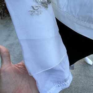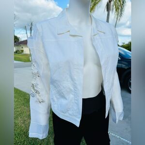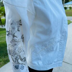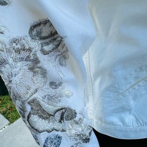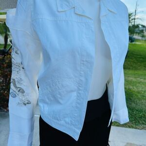 Gorgeous white open style blazer with silk embroidery on one sleeve.