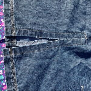 Fun blue jean skirt in great condition. I don’t see any flaws. Waist is about 31in. Length is about 24in. Cute little slit in the back and cool denim pattern. Works for summer and fall. From a smoke free home.