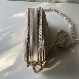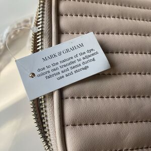 Product description from Mark and Graham is included in the photos and measurements can be found there too. This is a new bag but it is missing the price tag but the leather care tag is still attached and the chain strap is also still in its original packaging. There is some minor shelf/storage wear to the purse, there is one mark on the side which is visible in the photos. Please reference all photos for condition and measurements, they're part of the description. Thanks!