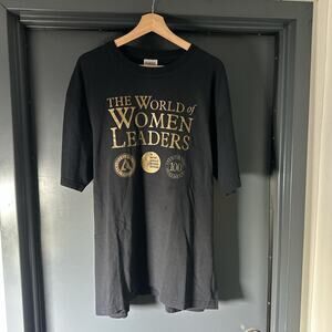 This Mark Athletic vintage tee shirt from the 90s features a bold “The World of Women Leaders” graphic, making it a standout piece with both retro style and meaningful design. Crafted in a comfortable XL fit, it offers a relaxed, easy-to-wear silhouette perfect for casual outfits. The graphic celebrates empowerment and leadership, giving the shirt a unique appeal for collectors and vintage fashion lovers alike. A great choice for those who appreciate 90s streetwear with a powerful message.