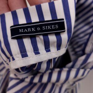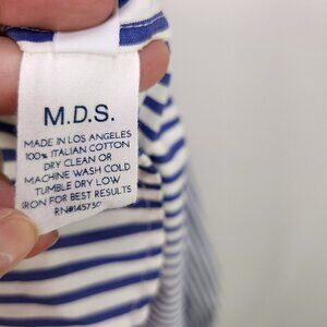 This Mark D Sikes striped midi dress in blue is ideal for the fashionable woman. Designed in a flattering A-line style, it features an open back and pockets, and is crafted from comfortable cotton. Women's size 2.