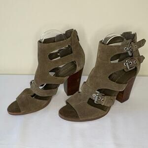 Chic and versatile, these Mark Fisher Calinda sandals feature soft olive green suede with cut-out details and buckled straps for a modern gladiator vibe. Set on a sturdy wood block heel with a convenient back zip closure. Never worn, but one heel shows slight discoloration (see photo).