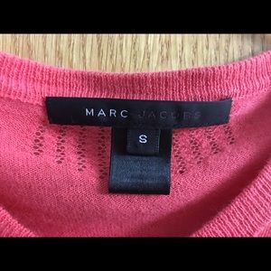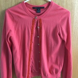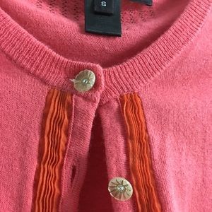 The sweater is more coral in color but the picture makes it look bright pink. It's very lightweight with orange detailing down the front. 3D buttons, gold with crystal center accent.