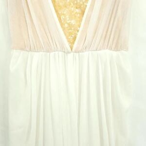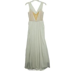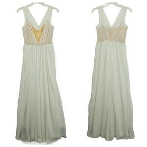 Elegant Mark & James by Badgley Mischka gown in white chiffon with gold sequin accents, ideal for formal occasions.