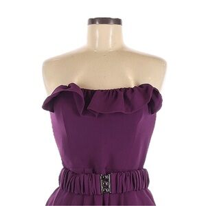 Stunning Mark & James by Badgley Mischka strapless mini dress in a bold berry purple hue. Features a flattering ruched belted waist with silver hardware, ruffle neckline, side pockets, and boning in the bodice for structure. Fully lined for comfort and sophistication—perfect for cocktail parties, weddings, or formal events.