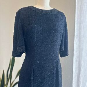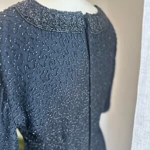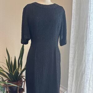 Elegant 1980s vintage black dress with intricate tonal beading throughout. Features a classic sheath silhouette with a softly rounded neckline, short sleeves. Beaded accents along the collar, sleeves, and hemline. Back zip closure. Fully lined. Tagged Medium – perfect for cocktail parties or vintage evening looks.