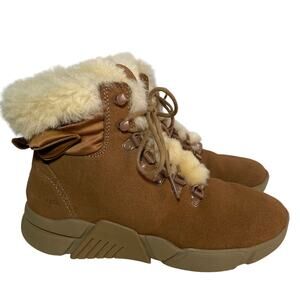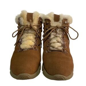 Soft sheepskin leather shearling-textured upper, Shearling lining, Memory Foam Lux insole, Water resistant 3M Scotchguard® treated finish, Side and heel stitched seam detail, Heel overlay panel with pull on top loop, Lace up front for adjustable comfort.