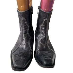 Mark Nason Rock Lives dragon boots, black leather, contrast stitching, embroidered dragon on the toe, studs, side zipper, short shaft, made in Italy, size 10, preowned and shows wear on the soles, scuffs - see photos