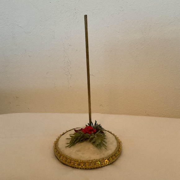 This is a Christmas/Holiday fairy stand for Mark Roberts fairies. It is a base decorated with white crystals to look like snow, with fir branches and holly leaves and berries. The back has felt to protect your furniture from scratching. A pole goes in the stand and into the back of a fairy for display.