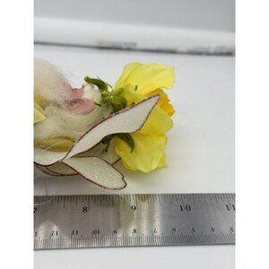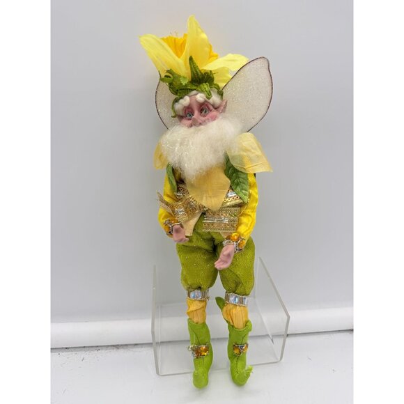 This is the smaller (10 inch) size fairy. He is dressed in yellow and green with a faux daffodil flower on his head.