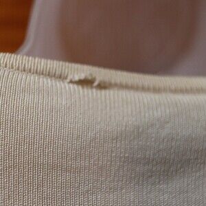 Soft elegance in this 2-piece Mark Shale set: a cream silk-linen cardigan paired with a matching shell tank. The cardigan is in nice shape with just a tiny loose thread at the back of the neck. The tank shell under has a split at the V-neck line, which could be repaired or styled under a camisole.