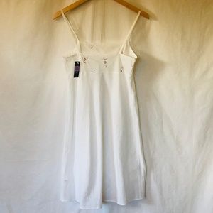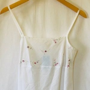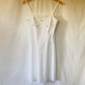 Mark & Spencer white chemise with floral embroidery at bodice and window pane woven design throughout. Size: Euro 8, US 6 Chest: 16" Length: 30" Condition: NWT B205