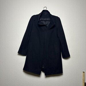 men’s UK 12, button-up front, notch lapel, tailored silhouette, fully lined, minimalist cold-weather outerwear, good condition