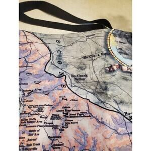 No tags. Looks very new besides two small holes where the tags must have been. It has a picture of Mark Twain on it and a map.