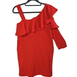 Mark Women's Size xs One Shoulder Ruffle Midi Dress Solid Bright Red Knee Length