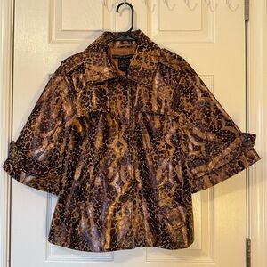 Add a touch of sophistication with this chic button-down shirt. Featuring a bold leopard print in brown and gold, it's perfect for any occasion.
