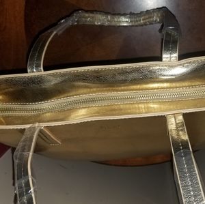 Mark and Graham Fillmore Vegan Leather Zipper Tote, Gold. New! Monogrammed "KEM". This zipper tote features a new silhouette that is taller and slimmer than the original tote. Thoughtfully designed from vegan leather, the new style features long comfortable straps for toting, a spacious interior that can fit up to a 15” laptop and a zippered closure to keep everything secure. 16”w x 14”h x 4”d. Monogram is foil debossed. Retails for $99. Buy today for $70