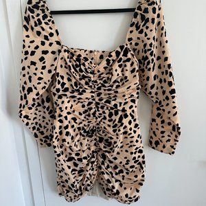 size 2 perfect condition mini dress. It is a beautiful satin material and the leopard print is a raised velvet. Ruched throughout its super flattering. I am on the taller side (5'8') and its definitely a mini on me but still very wearable. I have only worn it twice. Great Holiday party dress!