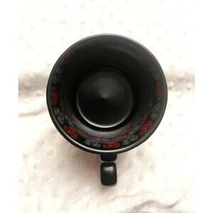 Brand new, Market Finds Black & Red Raised Roses Stained Glass Heart 14oz Ceramic Mug. Mug features red rose stained glass effect heart, gray/red/black roses & hearts inside of mug, and a black heart shaped handle. Measures 4 1/4" across top rim, 3 1/2" across the bottom, 4" tall, and has a 2 3/4" heart handle. Mug is dishwasher safe, not for microwave use. Comes from a smoke free, pet free home.