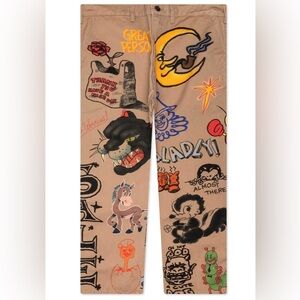 Standout streetwear from Market! These khaki pants feature a bold allover graphic print with colorful, tattoo-style artwork, cartoon characters, and playful phrases. Unique and eye-catching, perfect for anyone wanting to make a statement.