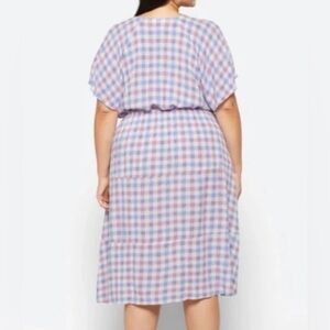 Market & Spruce 100% Rayon Pastel Checkered Dress with Pockets Plus 2X. The perfect summer dress, lightweight and flowy, a wrap front without being too low cut, pockets, breathable rayon. 25” pit to pit, 46” length.