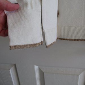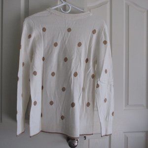Really cute cream colored crew neck pullover sweater. Metallic gold dots all over with matching trim at hem and cuffs. Size medium. 51% cotton, 39% rayon, 6% nylon, 4% other. Machine wash, dry flat. Gently worn.
