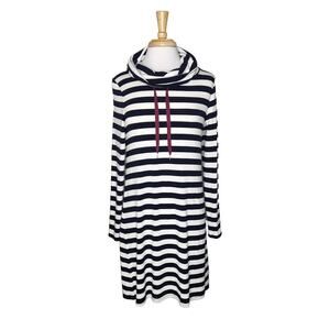 Features: Cowl neck with contrasting drawstrings, long sleeves, mini length, shift silhouette.