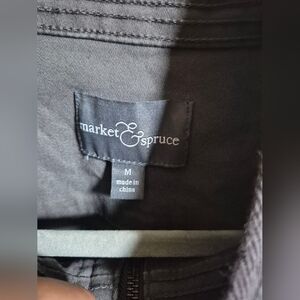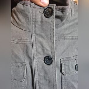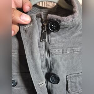 Stylish gray jacket with button-up front. Features multiple pockets. Perfect for casual wear.