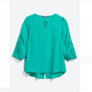 This blouse features embroidery details on the sleeves, a slight hi-lo hemline and a back vent for comfort and style.