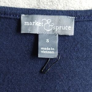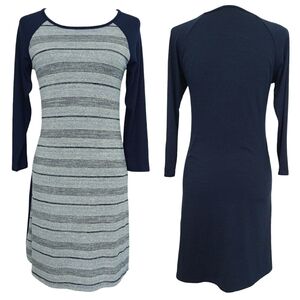 From Stitch Fix. Good used condition, with no stains or tears. A casual raglan sleeve knit dress, with a modern sporty look. Navy blue, with a grey striped front panel. The soft material has stretch. Scoop neck, and the sleeve length is between 3/4 and long sleeve.