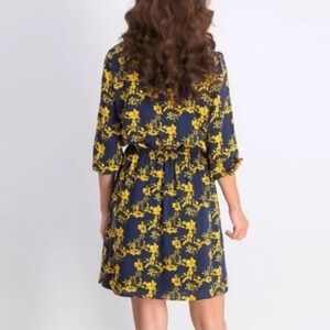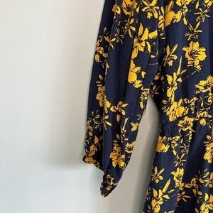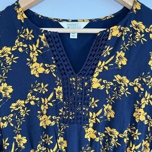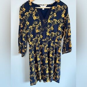 Market & Spruce Navy Mustard Floral Prim Crochet Trim Dress Elastic Waist Medium