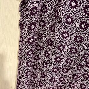 Market Spruce sleeveless blouse with buttons at the neckline. Purple and white color pattern with shirttail hem and flowing fabric.