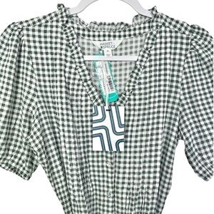Stitch Fix Market & Spruce Jessica Ruffle Neck Button Down Dress. In a green and white gingham print. Short sleeves. V-neck with ruffle detail Button front with self-tie belt. Lightweight material.