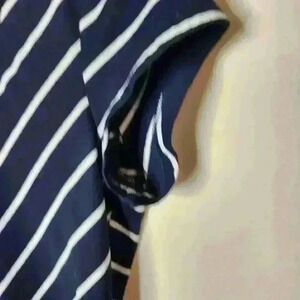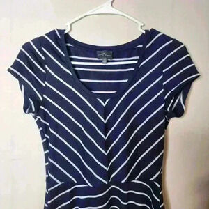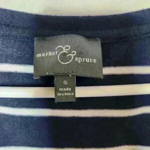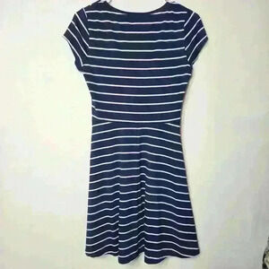 Market & Spruce women's navy blue and white striped A-line dress size small. Stretchy, t-shirt material. In excellent pre-owned condition. No flaws. Measurements are approximate and taken flat.