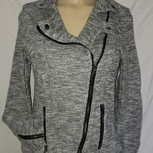 good used condition. black and white medium weight cotton. warm and fitted. zipper and button closure. versatile layering piece, perfect for fall and winter season.