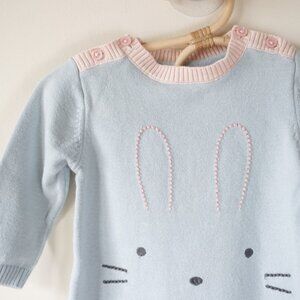 This is an adorable long sleeve, light blue sweater dress by Marks and Spencer, a UK-based clothing brand. Soft and comfortable with an embroidered face of a bunny on dress front. Features button closures at shoulders and contrast light pink trim.
