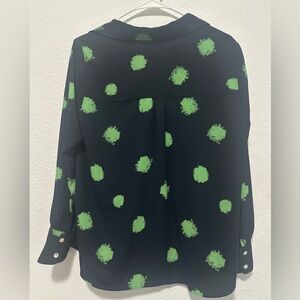 Stylish navy blouse featuring vibrant green polka dots. Perfect for casual or office wear.