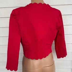 Red scalloped cropped bolero jacket by Autograph Marks & Spencer UK size 10 shown on 5’8” XS US mannequin