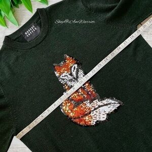 Just in: Markus Lupter rare dark olive sweater with sequin fox at front. Ribbed neck, cuffs, and hem. Crew neckline. Long sleeves. Relaxed fit.