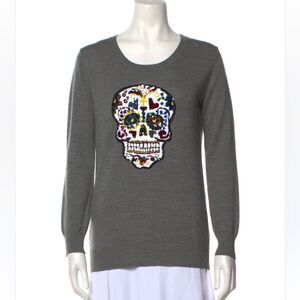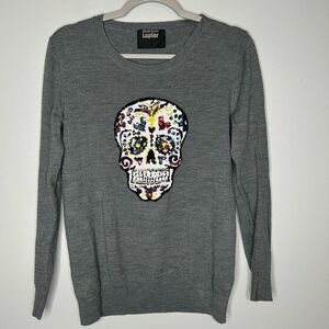 Size Small. Excellent condition. Stylish gray sweater with a colorful sequin skull design. Perfect for adding a bold touch to your outfit.
