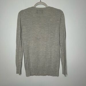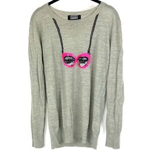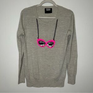 Size small. 100% Merino Wool. Stylish gray sweater with a playful pink sunglasses design. Perfect for casual outings.