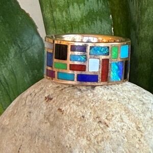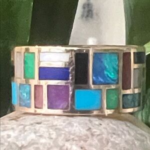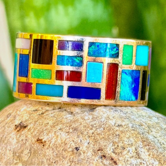 Discover the vibrant elegance of the Marla Aaron Multicolor Inlay Gold Ring. This exquisite piece features a stunning array of colors set in a luxurious gold band, perfect for adding a pop of color to any outfit. Some chips but need to look very close to see #90002