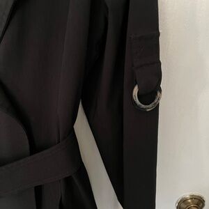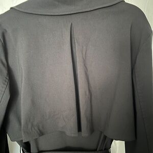 Great condition.No tears or marks. Cute cape effect in back. Tortoise buttons and belt rings. Has 3% Spandex for a comfortable fit. Side slits.