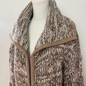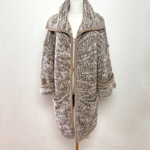 Beautiful and substantial Marla Wynne chunky knit sweater coat in a marled taupe and cream wool-blend yarn. This open-front piece features an oversized shawl collar, suede-like trim, and deep front patch pockets. Perfect for layering during cooler seasons — it blends the structure of a coat with the cozy feel of a cardigan.