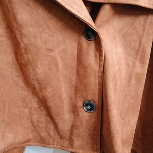Stylish rust cape jacket by MarlaWynne. Ideal for layering with a modern flair. I believe the material is swayed