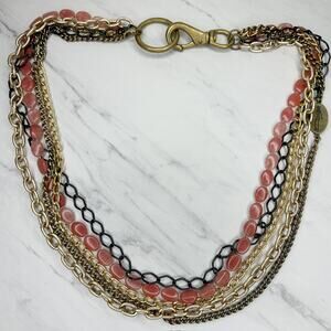 This absolutely gorgeous statement necklace is a true work of art! The "Delilah" features chunky strawberry quartz beads beautifully arranged in a multi-strand design with gold tone and black accents.